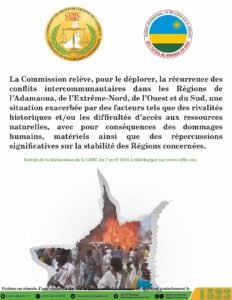 Dans sa déclaration marquante, l’instance présidée par le Pr James Mouangué Kobila déplore la recrudescence des conflits intercommunautaires, particulièrement dans les régions de l’Adamaoua, de l’Extrême-Nord, de l’Ouest et du Sud. Des conflits, souligne la Commission, souvent alimentés par des rivalités historiques et des difficultés d’accès aux ressources naturelles.