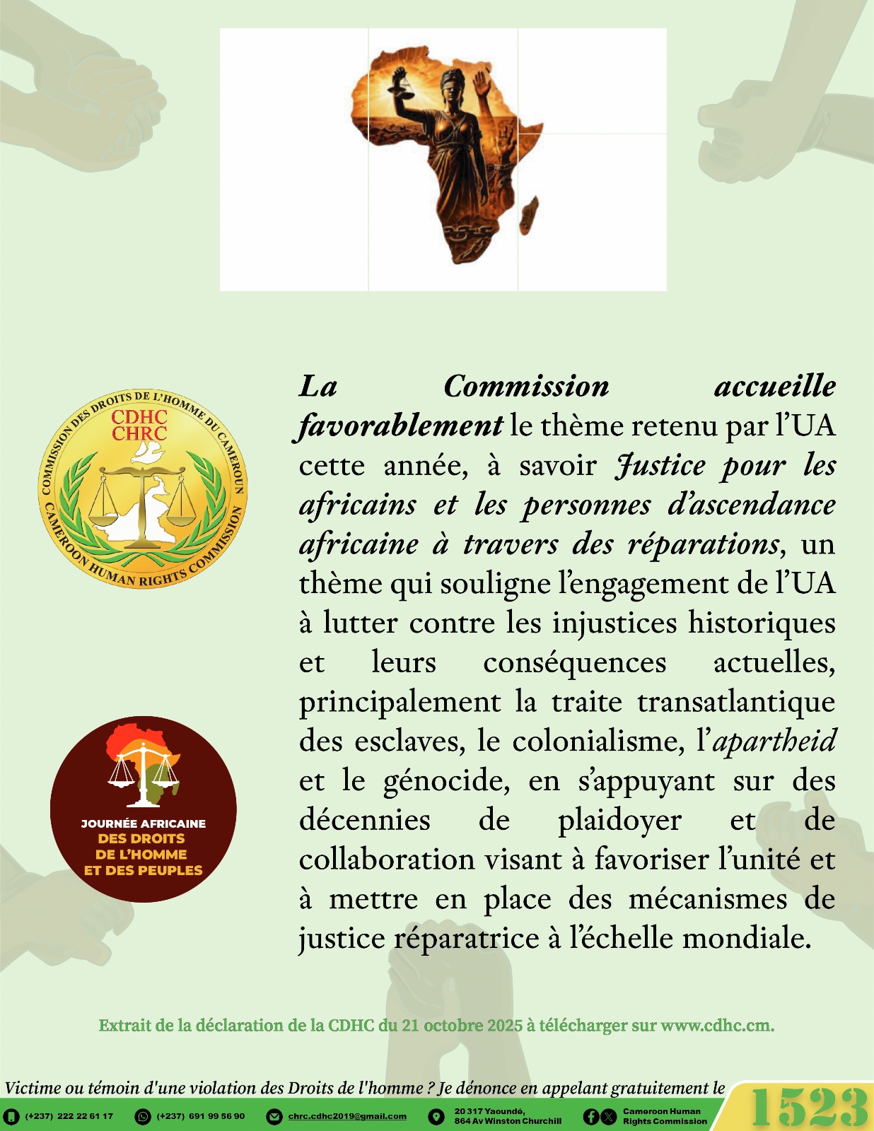Actualités Société Détention provisoire abusive au Cameroun : La CDHC tire la... À l’occasion de la Journée africaine des Droits de l’Homme et des Peuples commémorée ce 21 octobre sur toute l’étendue... BY PANELS_HEBDO 22 October 2025 0 Comments
